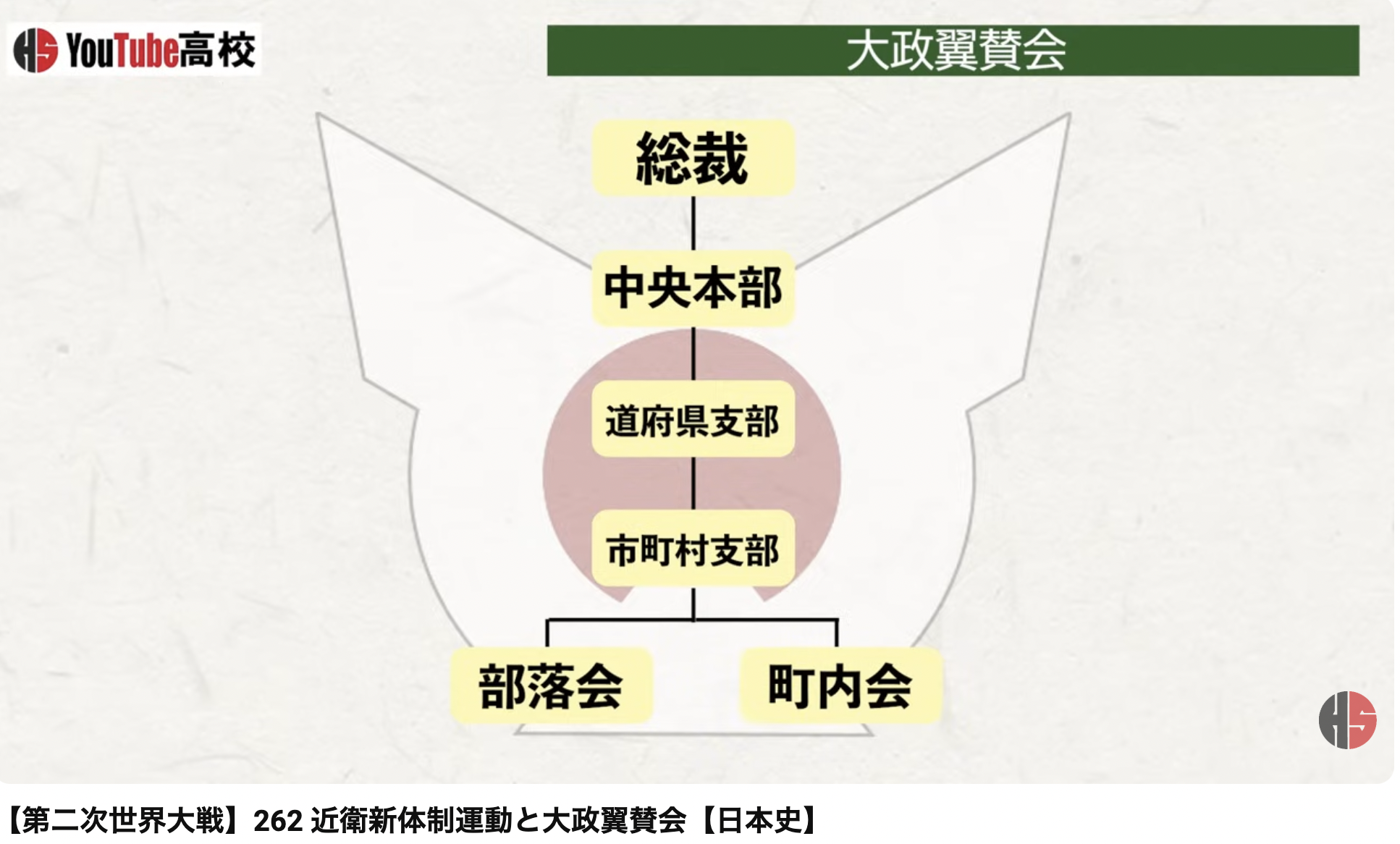 この動画で面白いなぁと思ったのは、9分あたりの大政翼賛会の構成図である。